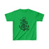 The kids heavy cotton tee is perfect for everyday use. The fabric is 100% cotton for solid colors. Polyester is included for heather-color variants. The shoulders have twill tape for improved durability. The collar is curl resistant due to ribbed knitting. There are no seams along the sides.